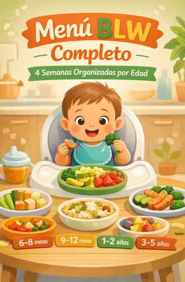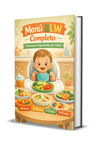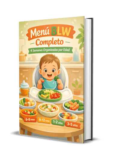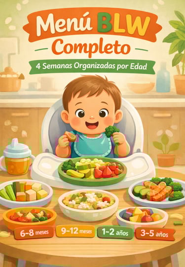 Un menú práctico y organizado con 4 semanas completas de comidas BLW, adaptadas por edad, para facilitar tu rutina diaria y ayudarte a ofrecer alimentos equilibrados, seguros y variados sin estrés.