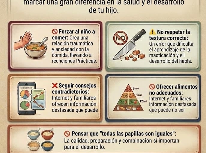 La guía está enfocada en buenas prácticas de alimentación infantil, con información organizada por edad, texturas y seguridad, para ayudarte a tomar decisiones más conscientes al alimentar a tu hijo.